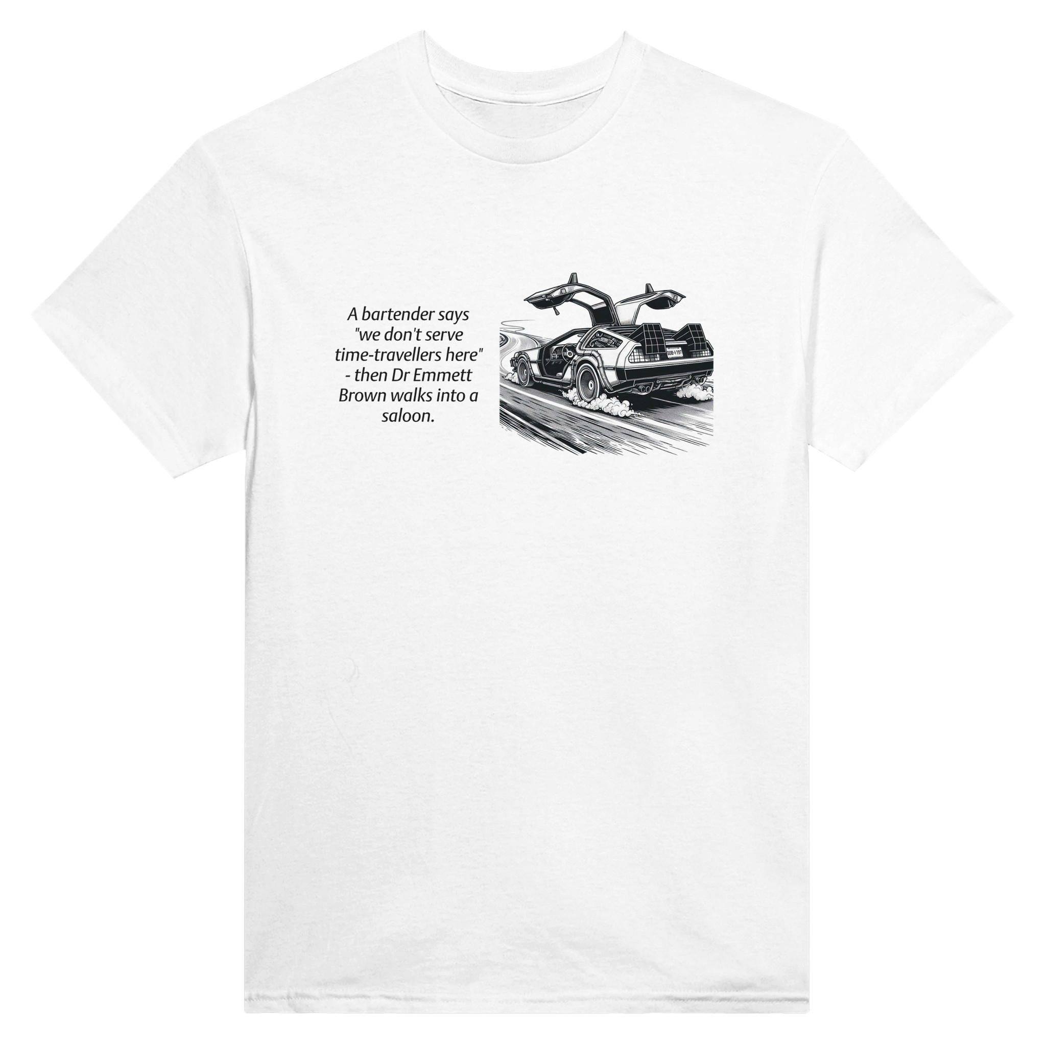 If a time traveller ever did walk into a bar I have no doubt it would be Dr. Emmett Brown and he’d have gotten there in the iconic Delorean. Just released our time traveller bar joke T-Shirt featuring the iconic Delorean. Available in multiple sizes and colours.